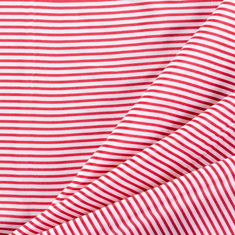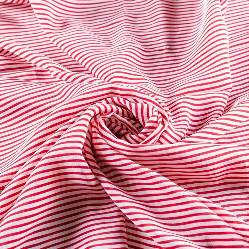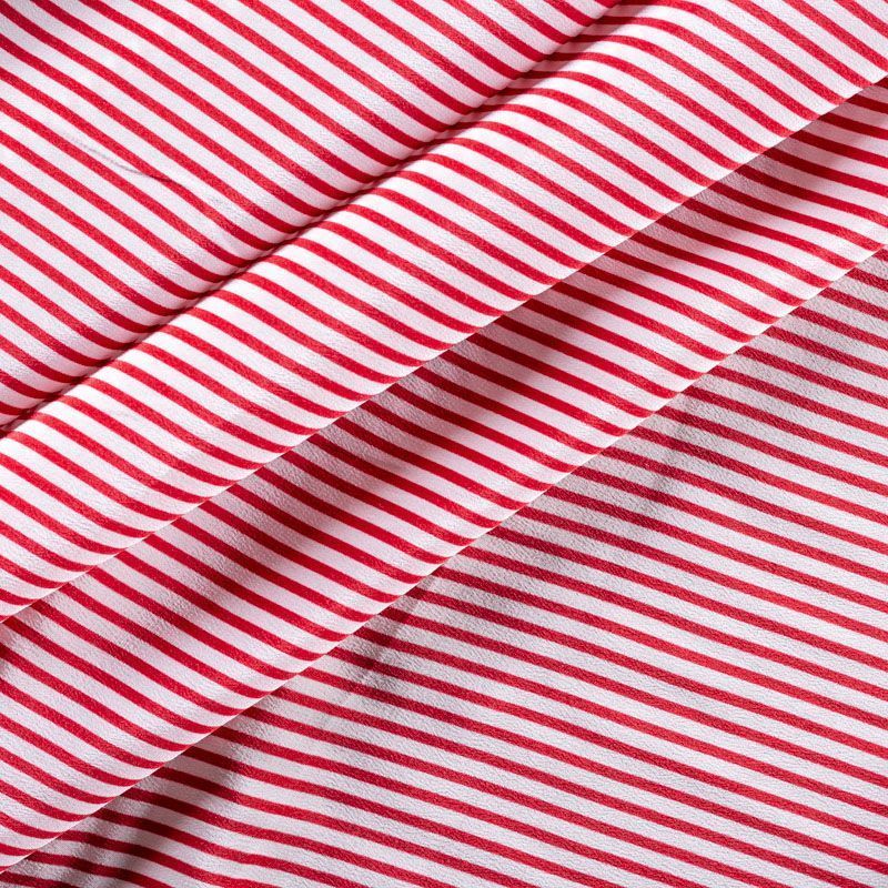Итальянский натуральный крепдешин в тонкую красную полоску тонкий, немного прозрачный, отлично драпируется, легкий и струящийся. Идеально подойдет для пошива платьев и сарафанов расклешенных моделей, с воланами, летящих юбок, топов, блузки, юбки, широких брюк, костюма в пижамном стиле.
