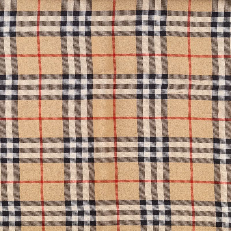 Тонкая шелковая ткань с узнаваемым принтом представляет собой крупную клеточку на золотисто-бежевом фоне. Этот крепдешин почти не просвечивает, хорошо драпируется, имеет матовую креповую поверхность. Идеально подойдет для пошива блузы, платья и юбки.