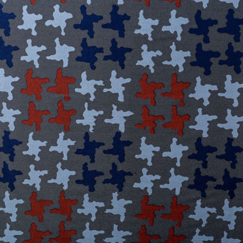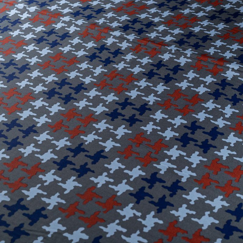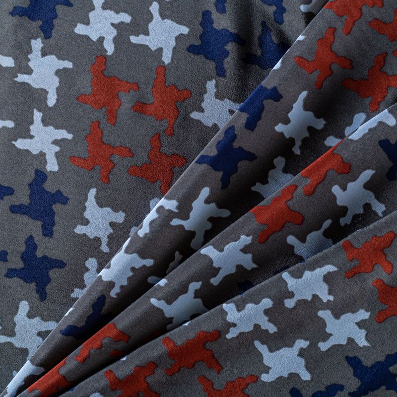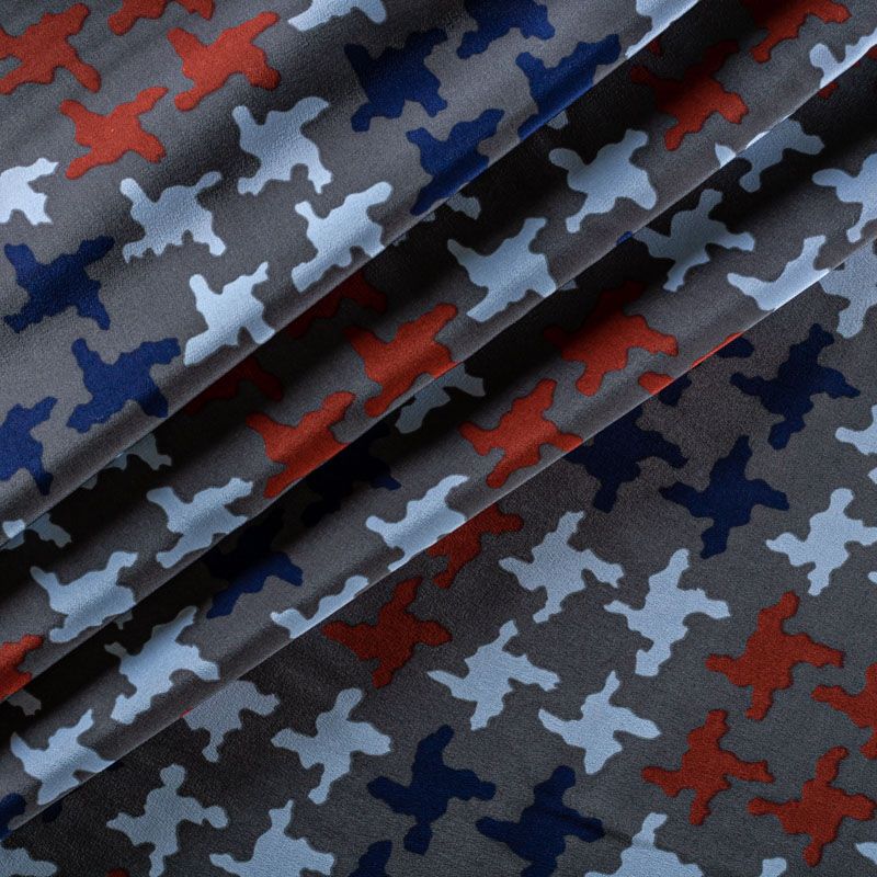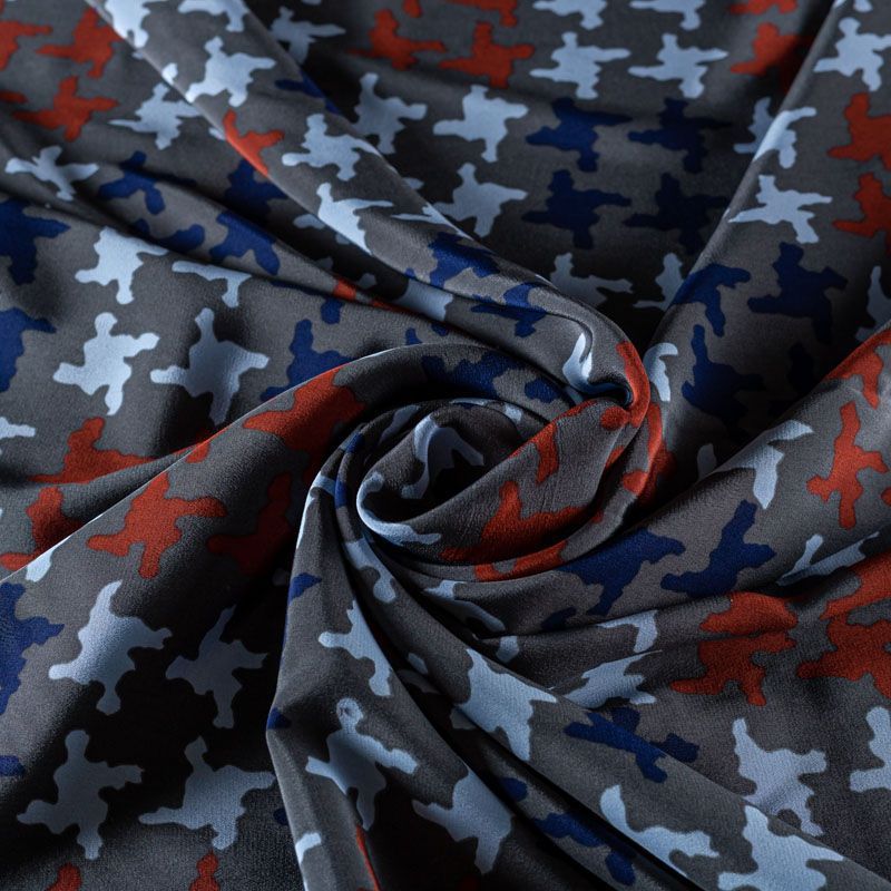 Натуральный шелковый крепдешин с матовой поверхностью, легкий, струящийся, хорошо драпируется. Стилизованный принт "гусиная лапка" принт выполнен терракотово-синей гамме на насыщенном сером фоне. Крепдешин прекрасно подойдет для пошива летнего сарафана, платья, топа, блузки, костюма в пижамном стиле, широких брюк или юбки.