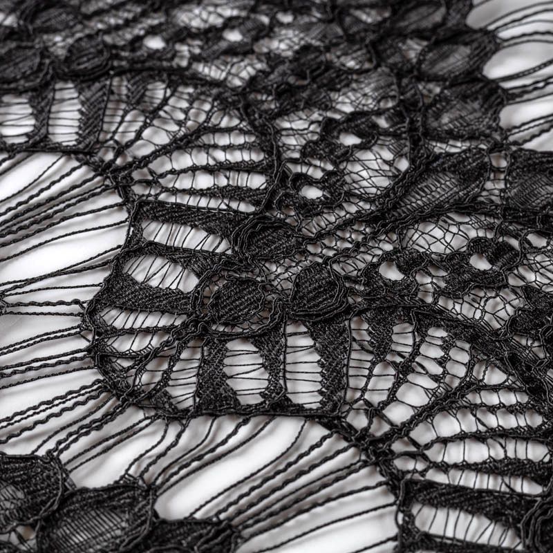 Ткань сквозной фактуры, она не имеет какой-либо тканной или сетчатой основы, а полностью соткана из нитей, создающий особенный рисунок, в целом, состоящий из небольшой ширины кружевных полосок, соединенных между собой тонкими нитями-ресничками, расположенными на одинаковом расстоянии между собой. Кружево можно использовать при пошиве самостоятельных изделий на подкладе (платья, топа, юбки, брюк), а также оно незаменимо в качестве отделки за счет фигурных фестонов.