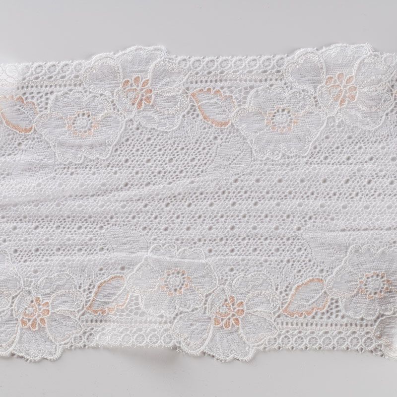 Эластичное кружево сочетает в себе мягкость, прочность и красоту, благодаря своей упругости оно долго не теряет первоначальную форму. Используется для пошива нижнего белья, а так же применяется как отделочный декор в одежде.