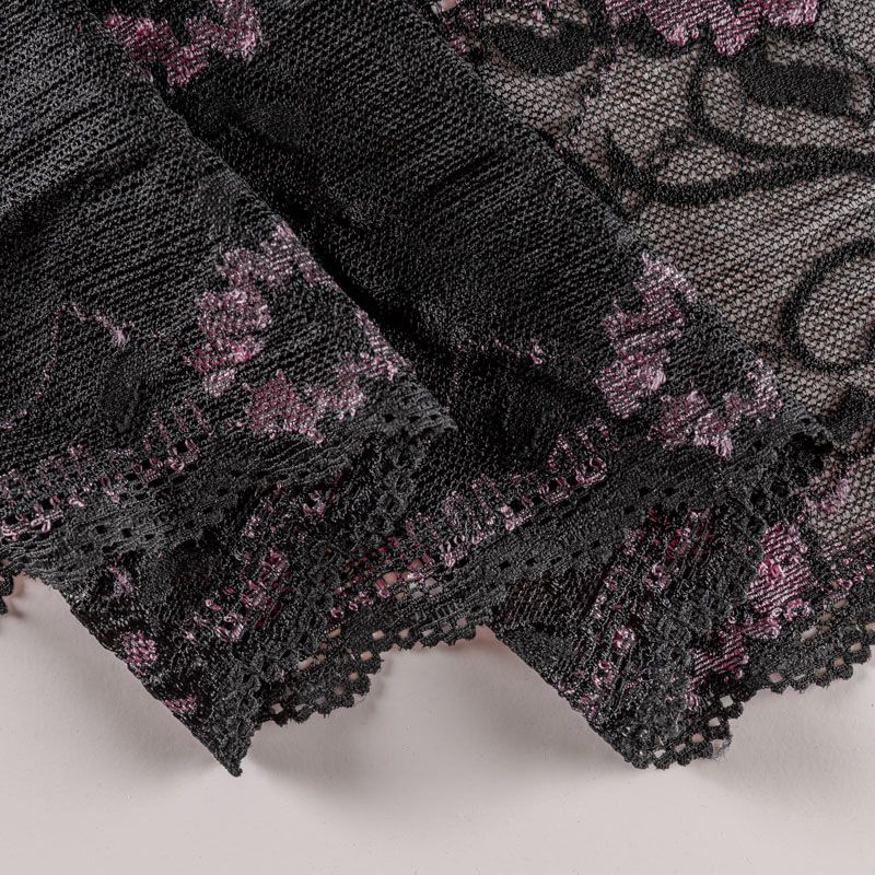 Эластичное кружево сочетает в себе мягкость, прочность и красоту, благодаря своей упругости оно долго не теряет первоначальную форму. Используется для пошива нижнего белья, а так же применяется как отделочный декор в одежде.