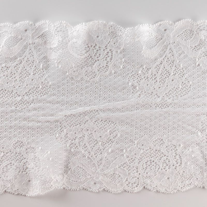 Эластичное кружево сочетает в себе мягкость, прочность и красоту, благодаря своей упругости оно долго не теряет первоначальную форму. Используется для пошива нижнего белья, а так же применяется как отделочный декор в одежде.