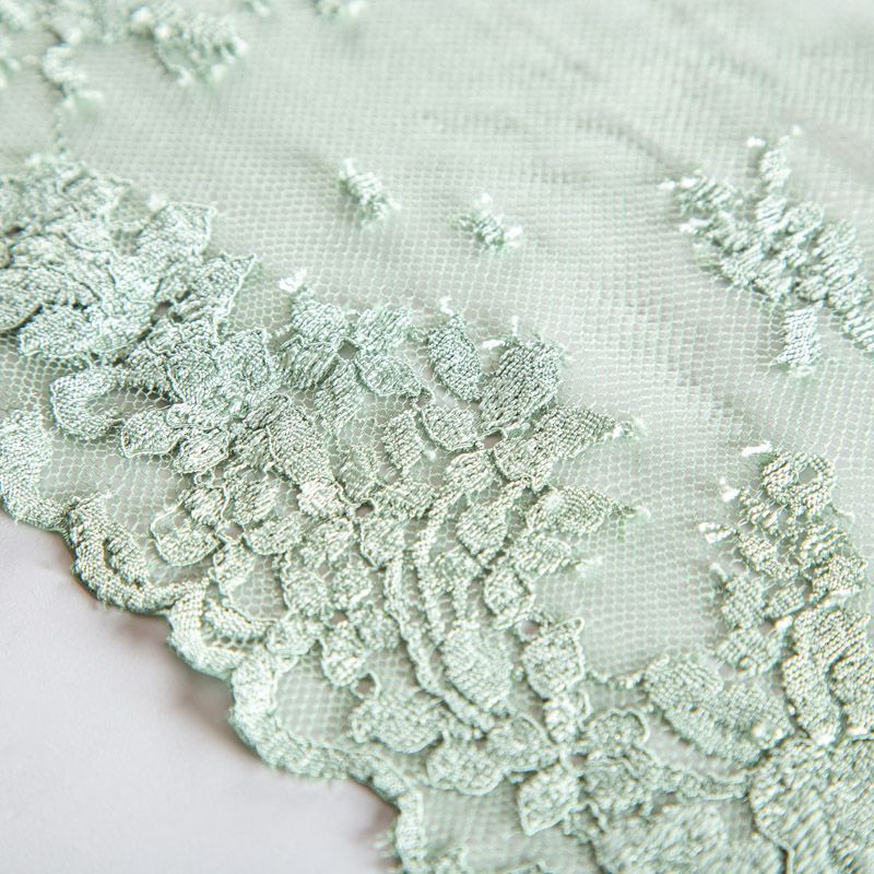 Эластичное кружево сочетает в себе мягкость, прочность и красоту, благодаря своей упругости оно долго не теряет первоначальную форму. Используется для пошива нижнего белья, а так же применяется как отделочный декор в одежде.