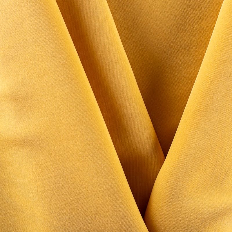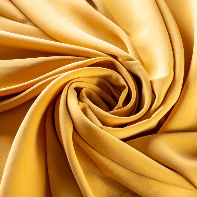 Купро плательно-костюмной плотности в оттенке золотистой охры. Ткань мягкая, пластичная, струящаяся, отлично драпируется, не просвечивает. Поверхность ткани бархатистая, похожа на мокрый шелк. Идеально подойдет для платьев свободного силуэта, брюк-палацио, юбок, шорт, туник, платья-рубашки, блузы.