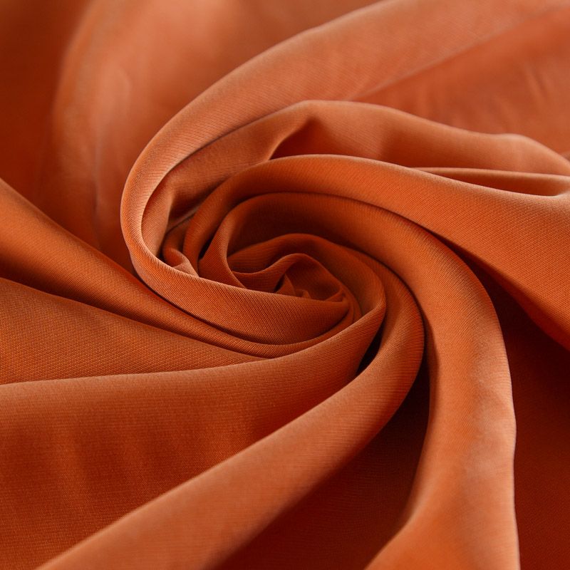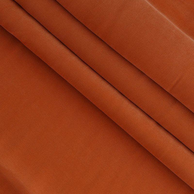 Итальянская купро плательно-костюмной плотности темно-оранжевого оттенка. Ткань мягкая, пластичная, струящаяся, отлично драпируется, не просвечивает. Поверхность ткани бархатистая, похожа на мокрый шелк. Идеально подойдет для платьев свободного силуэта, брюк-палацио, юбок, шорт, туник, платья-рубашки, блузы.