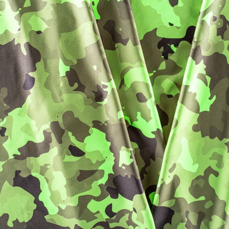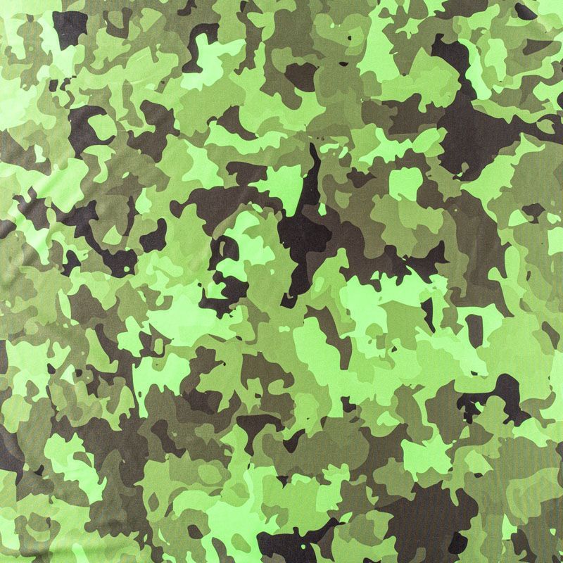 Итальянский бифлекс с камуфляжным принтом в зеленых оттенках. Поверхность ткани матовая и гладкая. Отлично тянется, одежда из него не сковывает движения. Хорошо впитывает влагу и быстро высыхает, не вызывет аллергии и раздражения. Используется для пошива эстрадных, спортивных костюмов, купальников, боди.