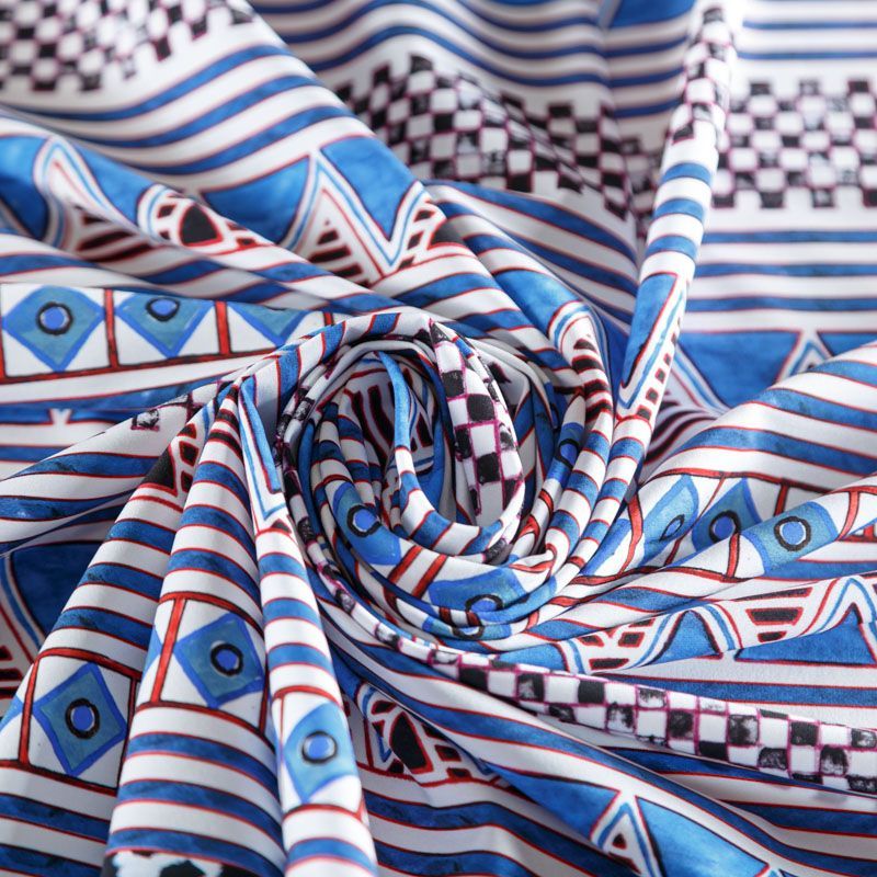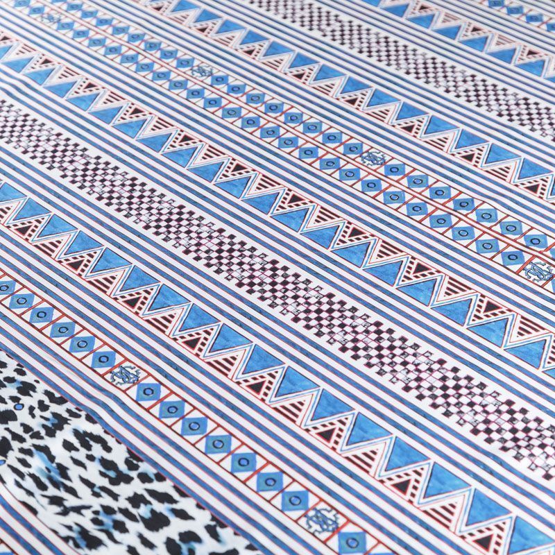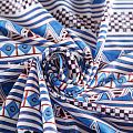 Итальяская качественная, красивая и приятная на ощупь лайкра белого цвета со сложным составным принтом в синих оттенках от известного бренда. Поверхность ткани матовая и гладкая. Идеально облегает фигуру, тянется по двум направлениям, хорошо драпируется, отлично держит форму, устойчива к пилингу, долговечна и гигроскопична. Используется для пошива одежды для танцев, гимнастики, фигурного катания, для велоспорта, легкой атлетики и аэробики, фитнеса и других видов спорта, для купальников, женского белья, театральных, цирковых и эстрадных костюмов.