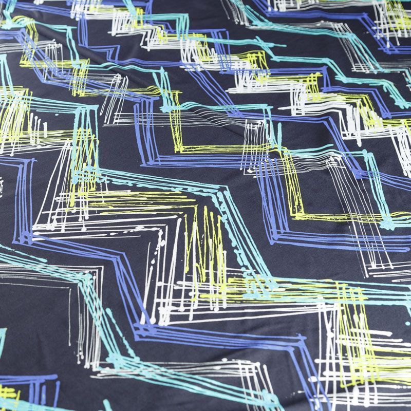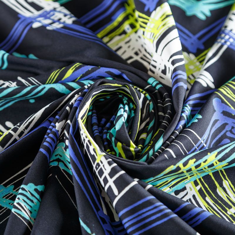 Итальяская качественная, красивая и приятная на ощупь лайкра черного цвета со стильным абстактным принтом в ярких неоновых оттенках. Поверхность ткани матовая и гладкая. Идеально облегает фигуру, тянется по двум направлениям, хорошо драпируется, отлично держит форму, устойчива к пилингу, долговечна и гигроскопична. Используется для пошива одежды для танцев, гимнастики, фигурного катания, для велоспорта, легкой атлетики и аэробики, фитнеса и других видов спорта, для купальников, женского белья, театральных, цирковых и эстрадных костюмов.