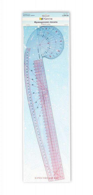 На лекале нанесена разметка: - 6, 12, 15 мм вдоль скругленной стороны, что позволяет проводить плавные линии и измерять скругленные участки; - 4, 6, 8 мм для создания ровных и длинных линий; - углы от 30° до 90° для построения угла нужного размера на выкройке. Метрическая система измерений: см и мм.