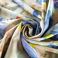 Льняная плательно-рубашечная ткань с добавлением бемерии в бежево-синих оттенках с абстрактным принтом. Материал прочный, с выразительной матовой рельефной поверхностью, полотняным плетением, хорошо держит форму, мягкий на ощупь, пластичный, отлично драпируется. Прекрасно подойдет для пошива летних платьев, сарафанов, юбок, рубашек, брюк и шорт.