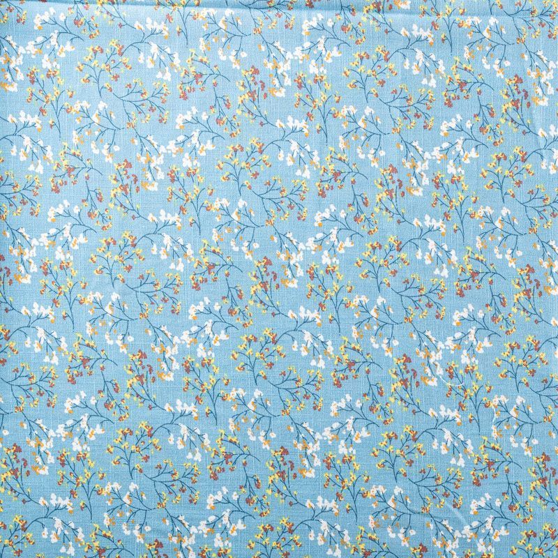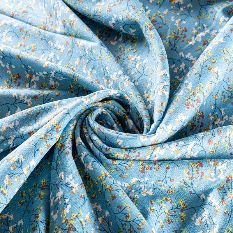 Льняная плательная ткань с добавлением вискозы серо-голубого цвета с растительным принтом. Материал прочный, с выразительной матовой рельефной поверхностью, полотняным плетением, хорошо держит форму, мягкий на ощупь, пластичный, отлично драпируется. Прекрасно подойдет для пошива летних платьев, сарафанов, юбок, рубашек, брюк и шорт.