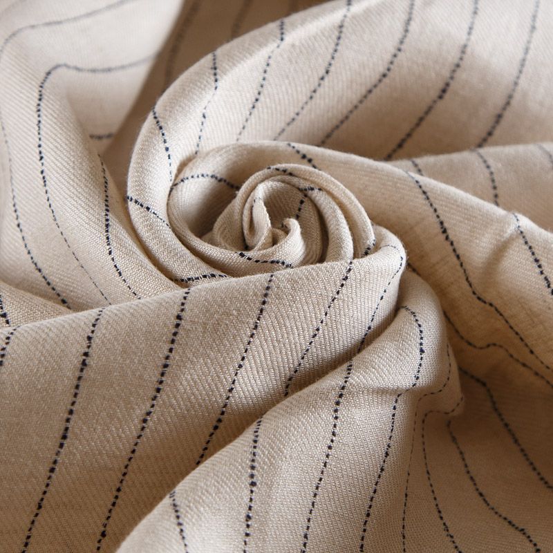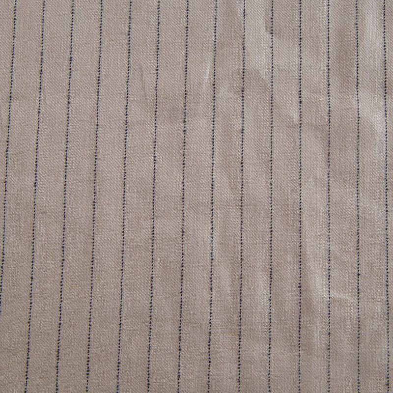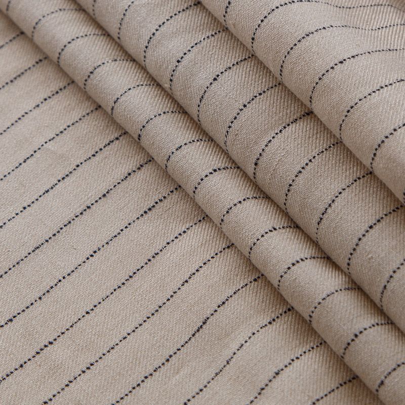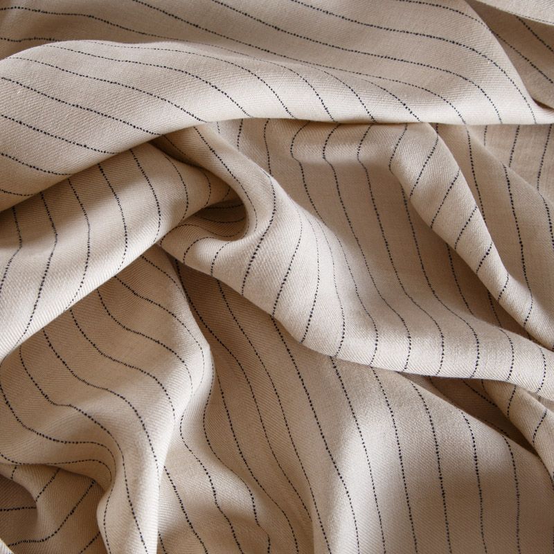 Итальянский лен в натуральном оттенке в тонкую полоску костюмно-плательной плотности. Поверхность ткани матовая, ровная, имеет диагональное плетение. Отлично держит форму. Подойдет для пошива костюмов свободного кроя, брюк, шорт, юбки, платья, рубашки, сарафана.