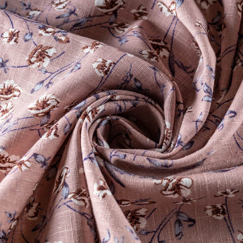 Прочный, выразительная матовая рельефная поверхность, полотняное переплетение, хорошо держит форму, мягкий на ощупь, пластичный, отлично драпируется. Прекрасно подойдет для пошива летних платьев, сарафанов, юбок, рубашек, брюк и шорт. Льняная плательная ткань с мелким цветочным принтом.