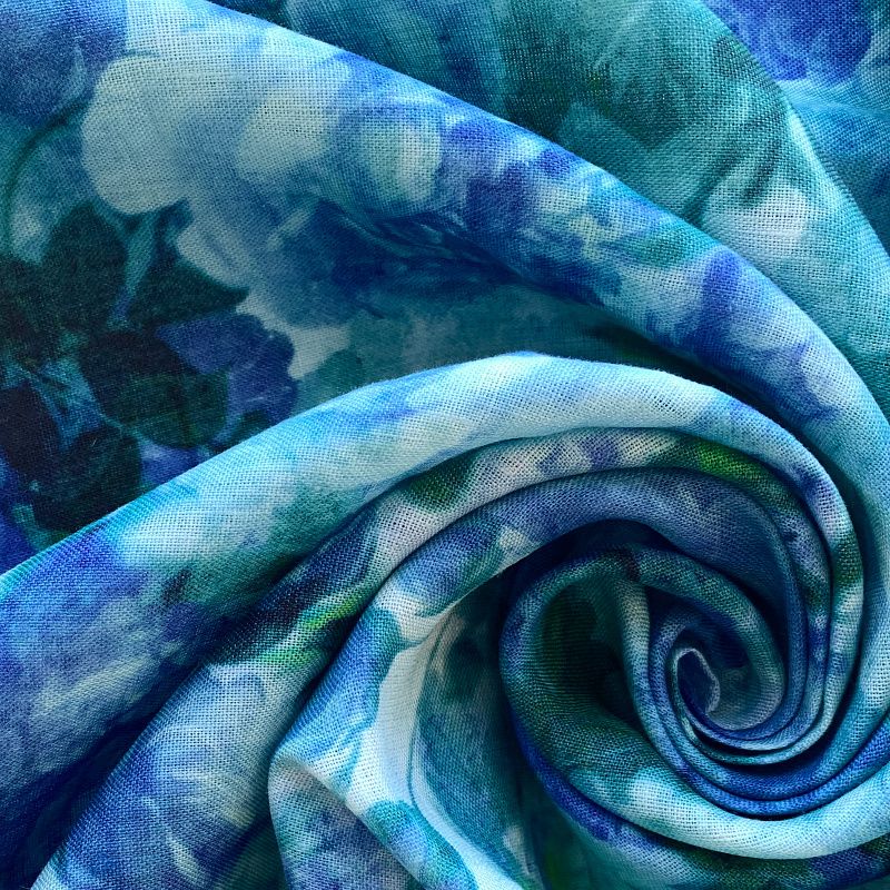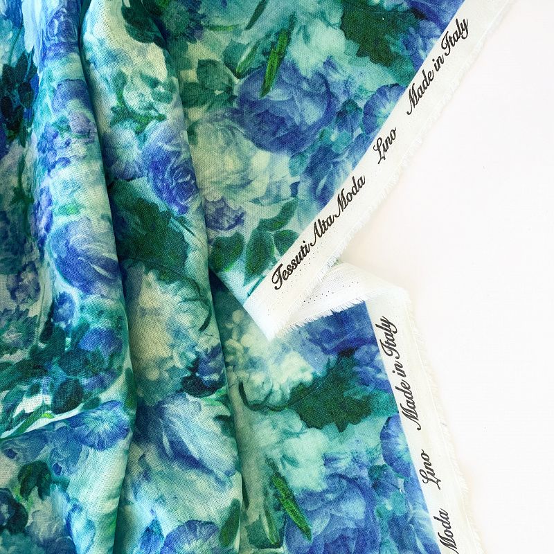 Прочный, выразительная матовая рельефная поверхность, полотняное переплетение, отлично держит форму, жестковатый на ощупь, но комфортный в изделии. Стильный вариант для летних пальто, платьев-футляров, сарафанов, юбок, жакетов, брюк или шорт. Льняная костюмно-плательная ткань с эффектным цветочным акварельным принтом в зеленых и голубых оттенках.