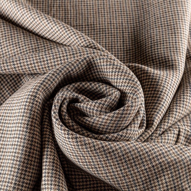 Прочный и плотный, выразительная матовая рельефная поверхность, полотняное переплетение, отлично держит форму, жестковатый на ощупь, но комфортный в изделии. Стильный вариант для летних пальто, платьев-футляров, сарафанов, юбок, жакетов, брюк или шорт. Льняная костюмно-плательная ткань с мелким принтом "гусиная лапка" в классических коричнево-синих тонах.