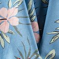 Прочный, выразительная матовая рельефная поверхность, полотняное переплетение, отлично держит форму, жестковатый на ощупь, но комфортный в изделии. Стильный вариант для платьев-футляров, сарафанов, юбок, жакетов, брюк или шорт. Льняная костюмно-плательная ткань с крупным цветочным принтом красно-коралловых оттенков на голубом фоне.