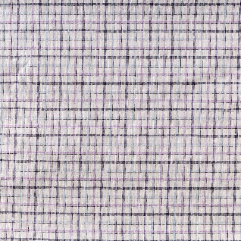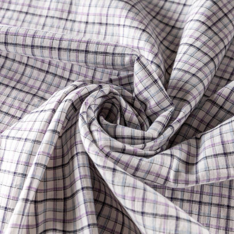 Плательно-рубашечный лен в сложную клетку в фиолетово-голубых оттенках. Ткань легкая, средней плотности, поверхность матовая. Приятная на ощупь, хорошо держит форму, тянется. Отличный вариант для летних  платьев, сарафанов, рубашек, брюк или шорт.