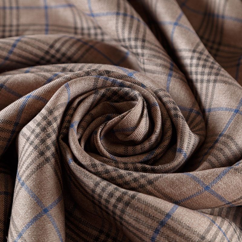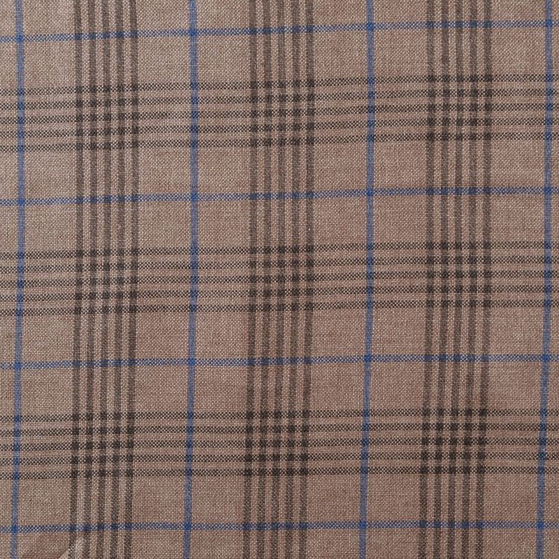 Итальянский костюмно-плательный лен с добавлением вискозы в бежевого оттенка в элегантную клетку. Ткань прочная, имееет на ощупь приятную поверхность, визуально - выраженный рельеф и полотняное переплетение, держит форму, пластичная. Подойдет для пошива летних костюмов, жилета, брюк, шорт, в том числе мужских, юбок, платьев, сарафанов, топов, комбинезонов, жакетов, кардиганов.