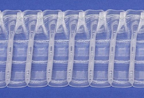 Прозрачная драпировочная шторная лента с вафельной складкой. Коэффициент сборки: 1:2.0, раппорт 66 мм, расстояние между складками 35 мм, количество рядов кармашков - 4, количество стягивающих шнуров - 4. Максимальная глубина складки 15,5 мм.