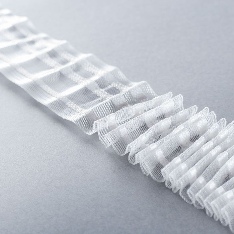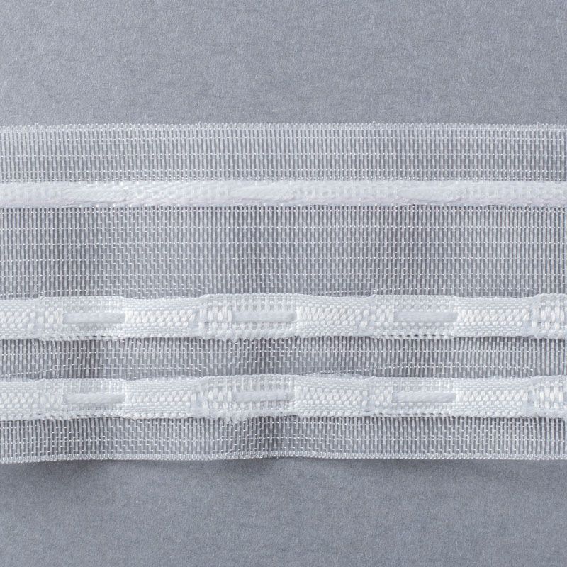 Шторная лента прозрачная для тюлей и портьерных тканей с карандашной сборкой. Сокращение - 1:2, раппорт - 24 см, 2 ряда непрозрачных белых кармашков, крепление - крючки.