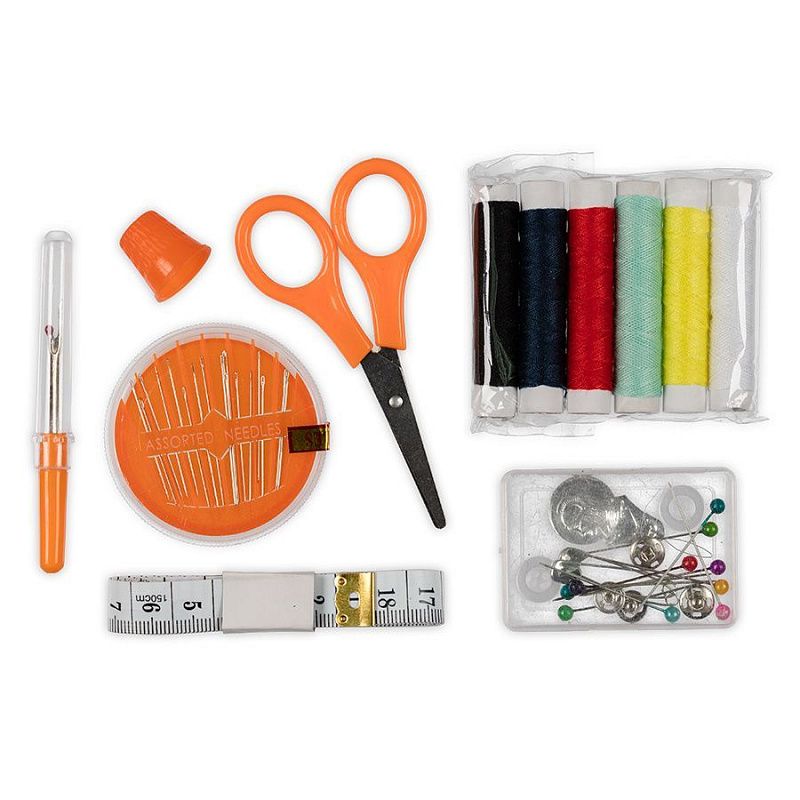 Состав набора: сантиметр 150 см -1шт, иглы в круге -16 шт, нитки - 6 катушек, ножницы - 1 шт, английские булавки - 2 шт, булавки для закалывания с шариком - 10 шт, кнопки пришивные - 2 пары, пуговицы - 2 шт, нитковдеватель - 1 шт, вспарыватель - 1 шт, наперсток - 1 шт.
