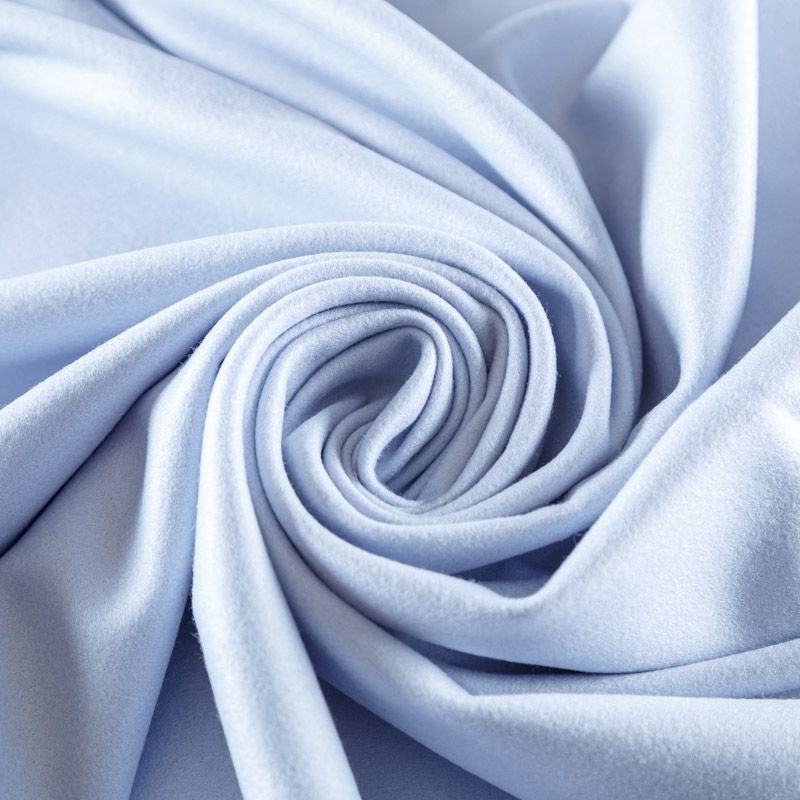 Плотный пальтовый трикотаж голубого оттенка. Ткань очень приятная на ощупь, мягкая, пластичная, теплая и уютная. Прекрасно подойдет для пошива легких пальто, пальто на подкладе, теплых жакетов, курток, кардиганов, бомбера, жилета.