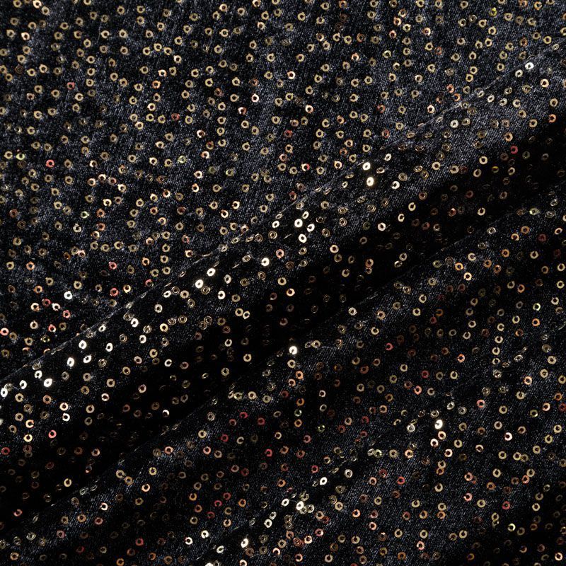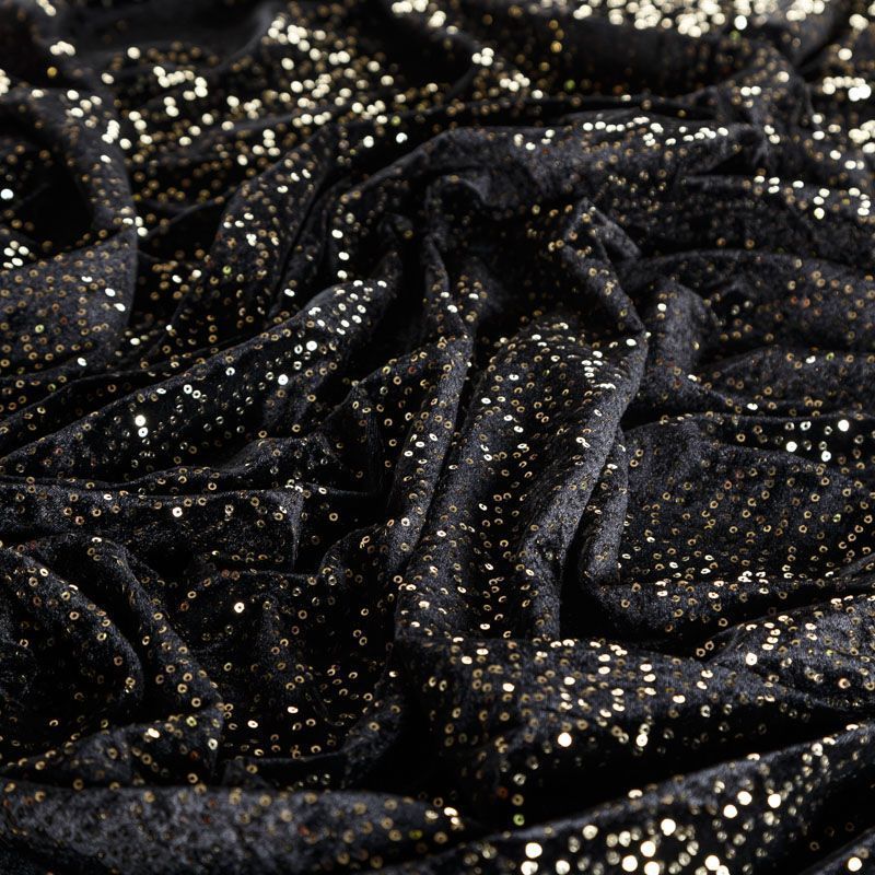 Роскошкный черный бархат с мелкими блестящими пайетками золотистого цвета. Необычное сочетание фактур и итальянское качество делают эту ткань яркой и нарядной. Она очень эластичная, мягкая и пластичная, красиво драпируется и ниспадает. Пайетки отлично подойдут для вечеринок, праздничных вечеров, корпоративов и других мероприятий в качестве платья, брюк, шорт, юбки, жакета, боди, топа, туники или комбинезона.