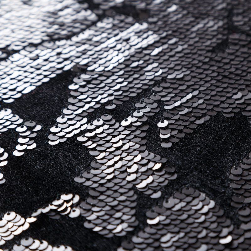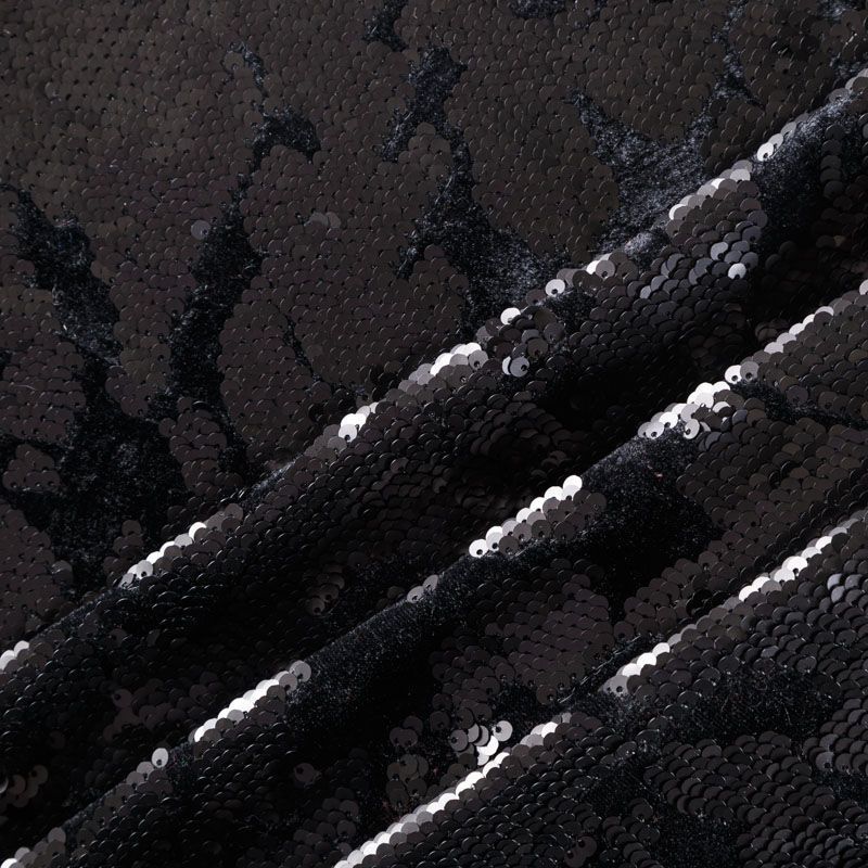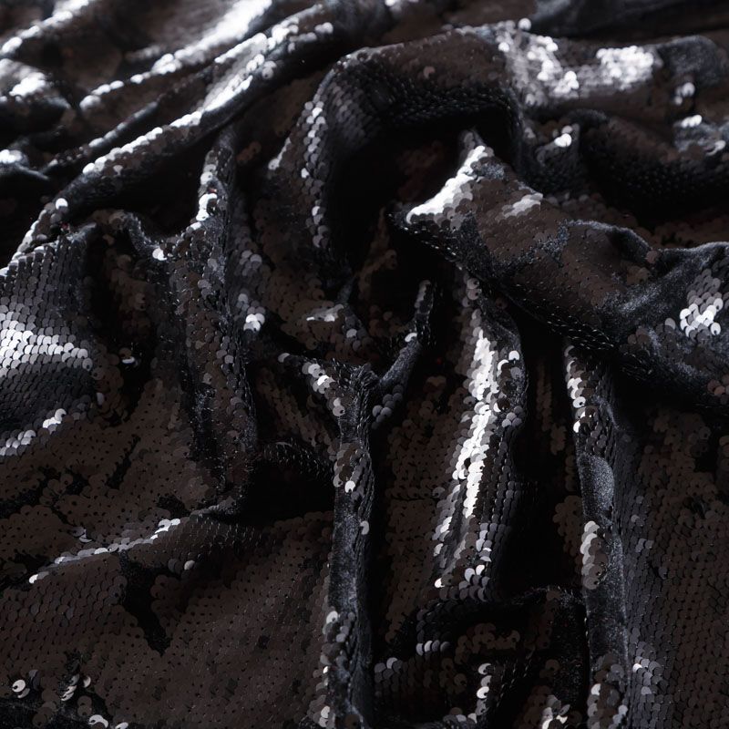 Структурированные пайетки, вышиты на эластичной бархатной основе черного цвета. Ткань яркая и выразительная, красиво переливается, очень нарядная, хорошо драпируется, пластичная и эластичная и в длину, и в ширину, благодаря чему изделия получаются комфортными и отлично сидят по фигуре. Пайетки — идеальный материал для праздников и вечеринок, также отлично впишутся в стиль "спорт-шик". Из них получится эффектное платье, жакет, боди, топ, туника, юбка или комбинезон.
