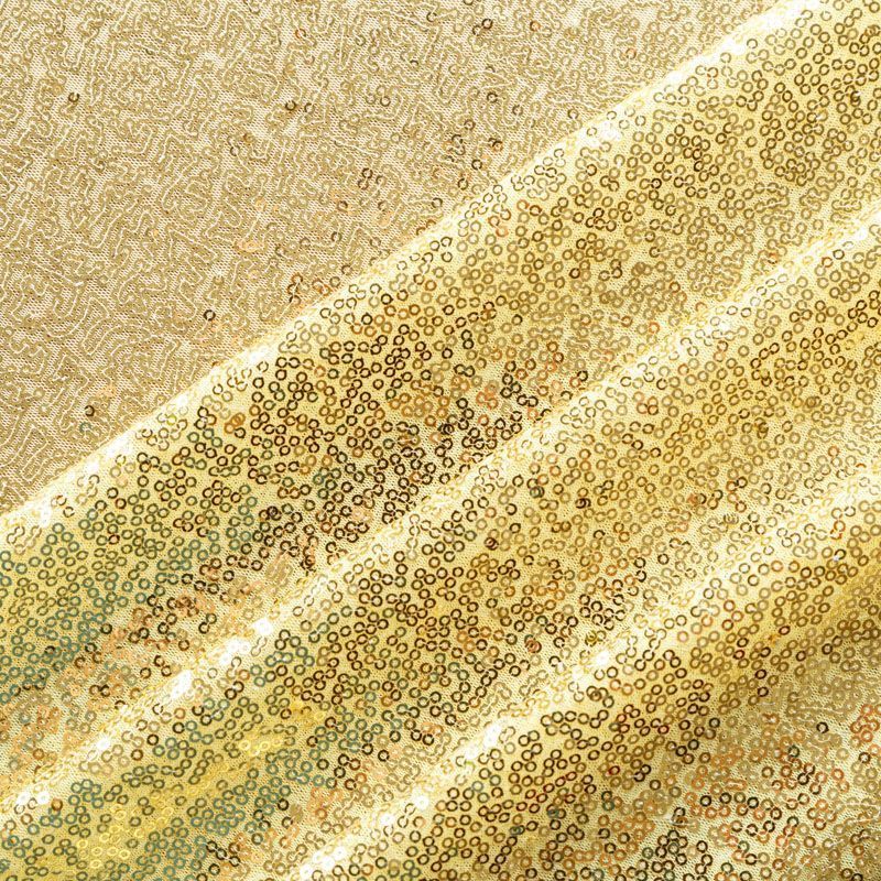 Блестящие пайетки в золотистом оттенке. Мелкие, размером около 3 мм, расположены в хаотичном порядке. Основа - мягкая и эластичная сетка.  Ткань полупрозрачная, может потребоваться подклад. Подойдет для вечернего, коктейльного платья, юбки, нарядных детских изделий, танцевальных и сценических костюмов.