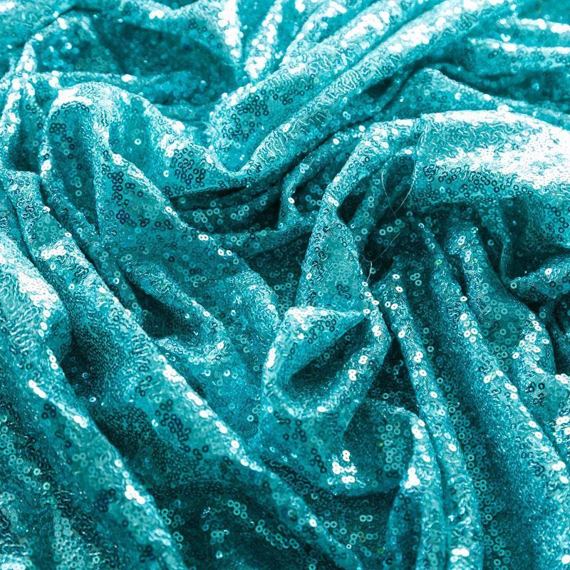 Блестящие пайетки в бирюзовом оттенке. Мелкие, размером около 3 мм, расположены в хаотичном порядке. Основа - мягкая и эластичная сетка. Ткань полупрозрачная, может потребоваться подклад. Подойдет для вечернего, коктейльного платья, юбки, нарядных детских изделий, танцевальных и сценических костюмов.
