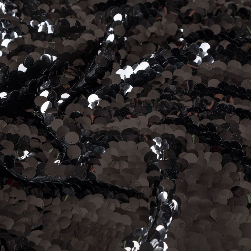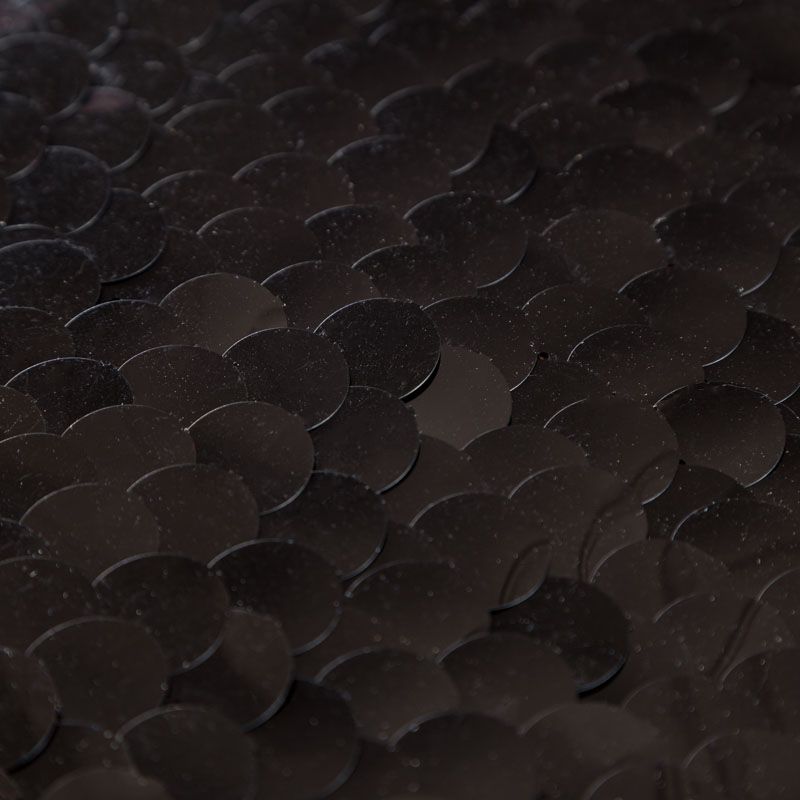 Крупные пайетки черного цвета нашиты на эластичную трикотажную сетку того же цвета как "чешуя". Пайетки матовые, круглые, в виде монеток. Настил не плотный, может требоваться подклад. Размер пайеток 1,8 см.  Ткань на ощупь мягкая и пластичная, хорошо тянется. Идеально подойдет для вечерних и праздничных образов в качестве юбки, платья, туники, топа, костюма.