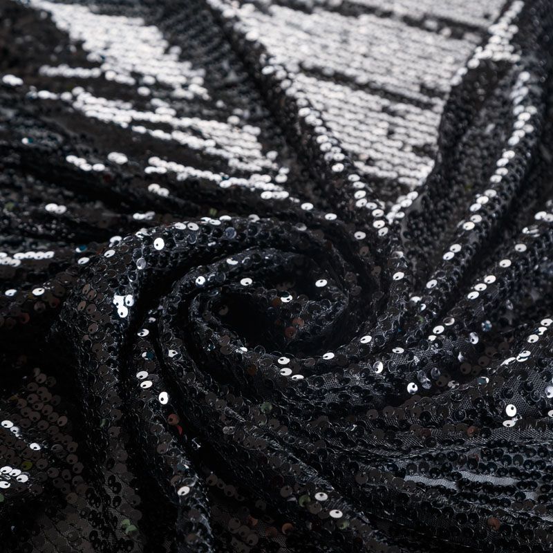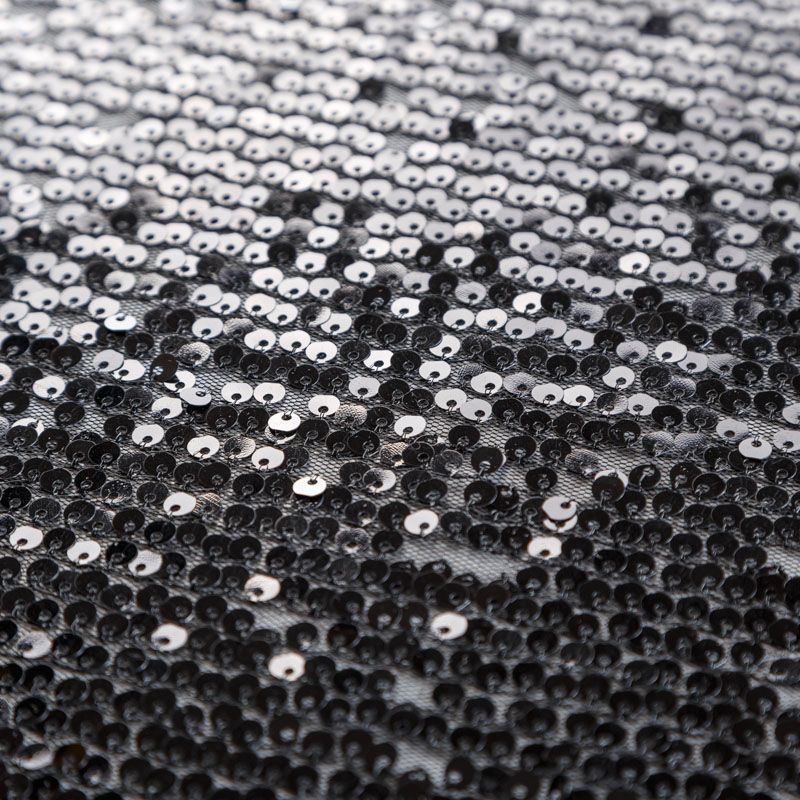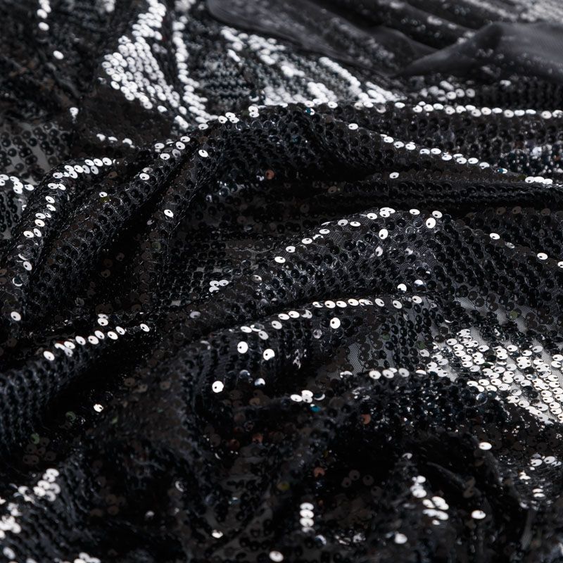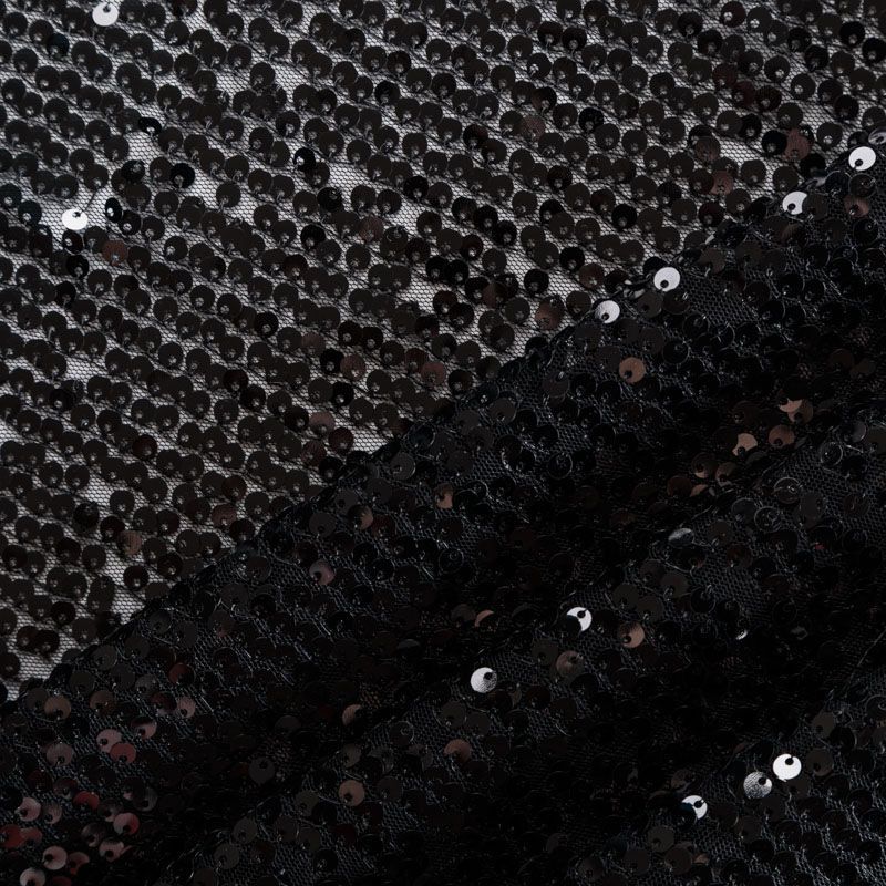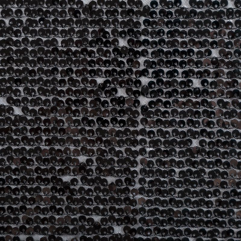 Тонкая мягкая эластичная сетка черного цвета по всей поверхности усеяна глянцевыми мекими пайетками в тон основе. Ткань очень хорошо драпируется, красиво переливается, пластичная и эластичная и в длину, и в ширину, благодаря чему изделия получаются комфортными и отлично сидят по фигуре. Пайетки — идеальный материал для праздников и вечеринок, также отлично впишутся в стиль "спорт-шик". Из них получится эффектное платье, жакет, боди, топ, туника, юбка или комбинезон.