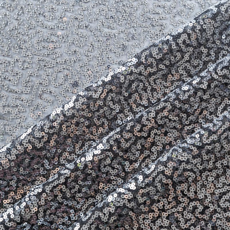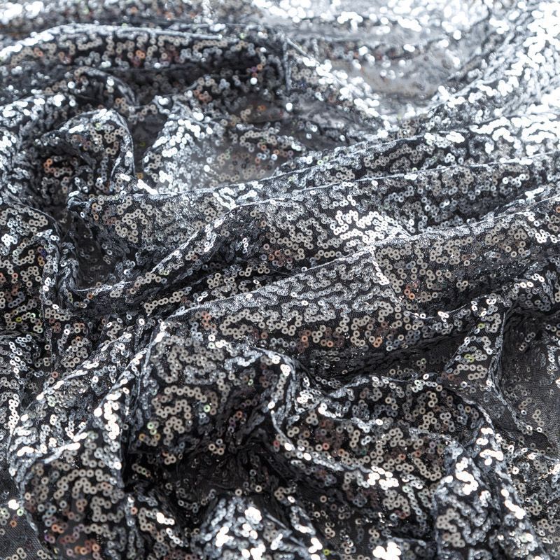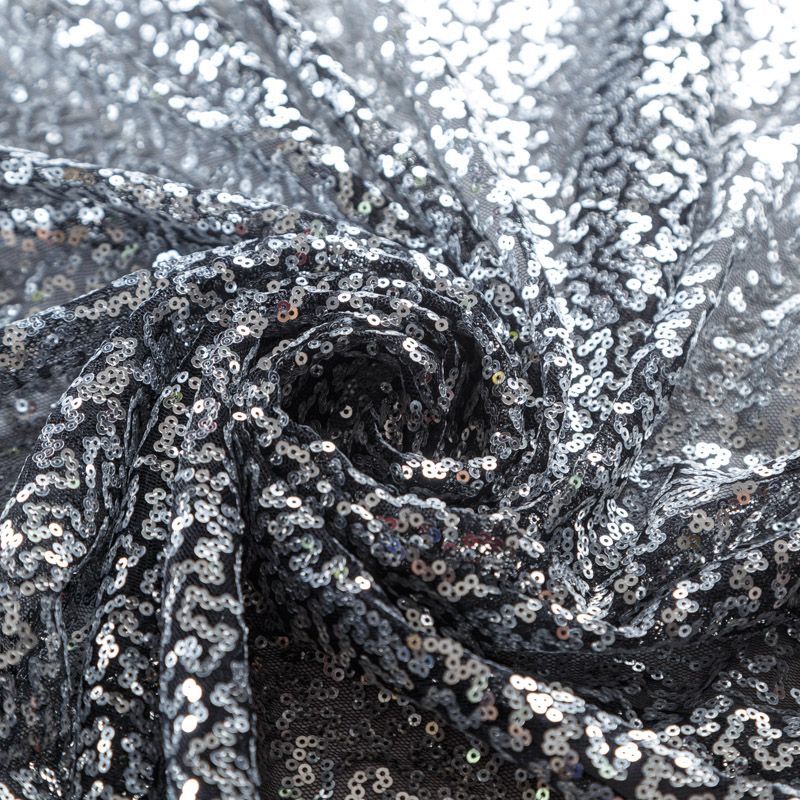 Тонкая эластичная сетка черного цвета расшита мелкими глянцевыми серебристыми пайетками. Ткань очень хорошо драпируется, красиво переливается, пластичная и эластичная и в длину, и в ширину, благодаря чему изделия получаются комфортными и отлично сидят по фигуре. Пайетки — идеальный материал для праздников и вечеринок. Из них получится эффектное платье, жакет, боди, топ, туника, юбка или комбинезон.