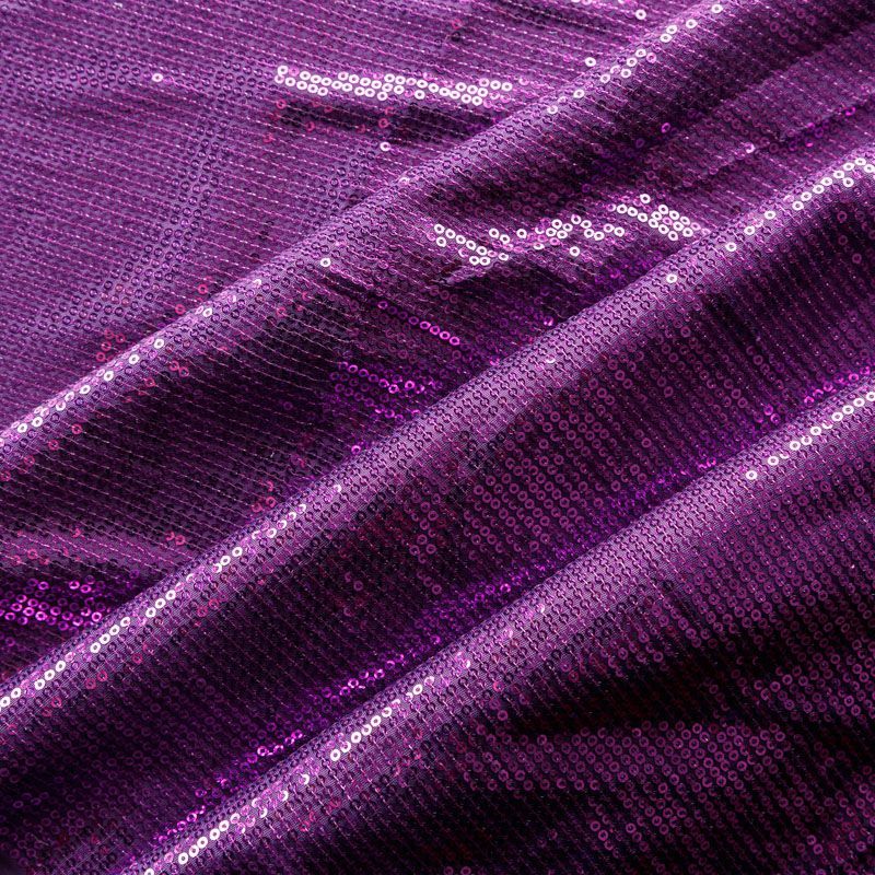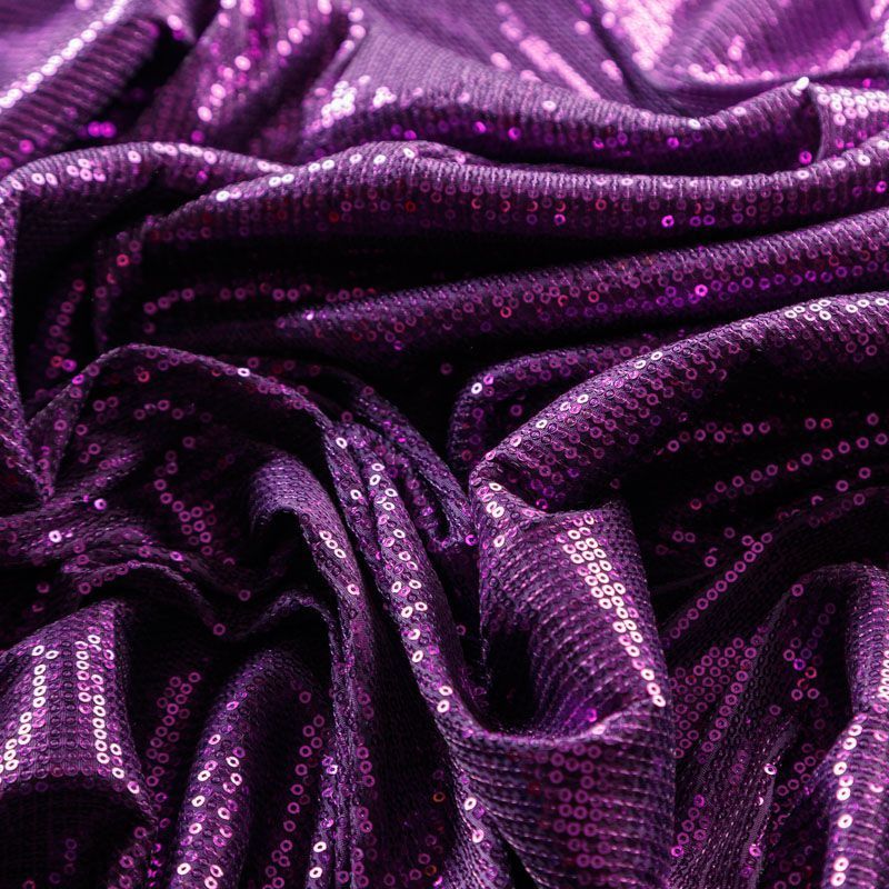 Блестящие пайетки в пурпурном оттенке. Мелкие, размером около 3 мм, расположены в хаотичном порядке. Основа - мягкая и эластичная сетка.  Ткань полупрозрачная, может потребоваться подклад. Подойдет для вечернего, коктейльного платья, юбки, нарядных детских изделий, танцевальных и сценических костюмов.