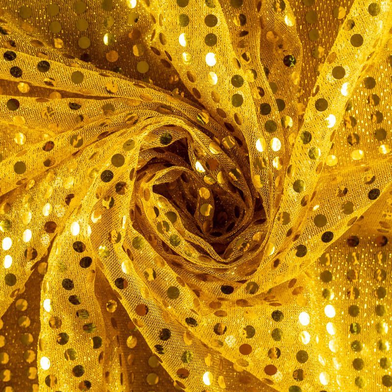 Полупрозрачный переливающийся материал, основа которого, из тонкого сетчатого трикотажа с люрексом. Полотно усеяно блестящими зеркальными круглыми пайетками диаметром 6 мм. Ткань идеально подойдет для декорирования элементов костюма, пошива вечерних нарядов, концертных и танцевальных костюмов.