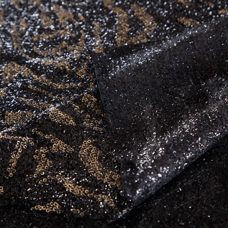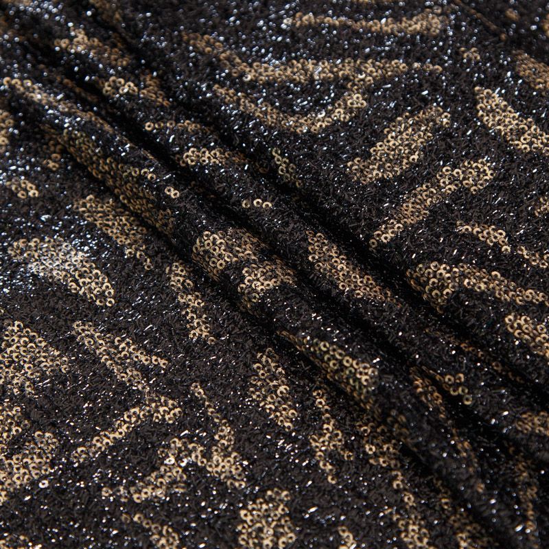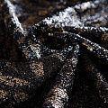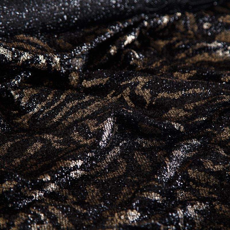 Итальянские пайетки на трикотажной основе с люрексовой нитью с абстрактным черно-золотым принтом. Полотно не много рыхлое, пластичное, тянется, не просвечивает, хорошо драпируется. Подойдет для пошива платьев, юбки, комбинезона, топа, лонгслива, боди.