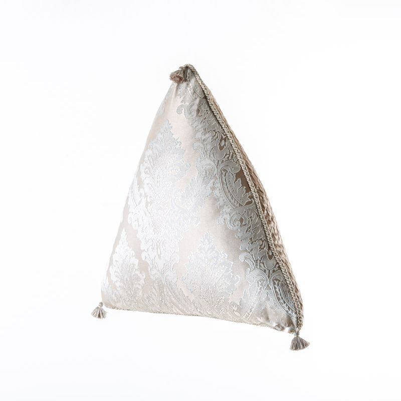 Оригинальная треугольная дизайнерская подушка 55х55х55 см. Выполнена из жаккарда и декорирована кисточками и витым шнуром. Потайная молния расположена в нижнем шве. Декоративные подушки сделают акцет на цветовой гамме Вашего помещения, подчеркнут особенности интерьерного стиля или тематику оформления. Внутреннее наполнение синтепон в хлопковом чехле.