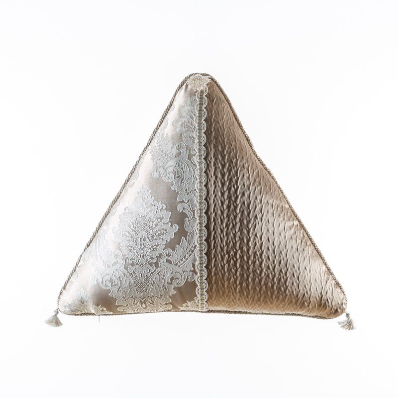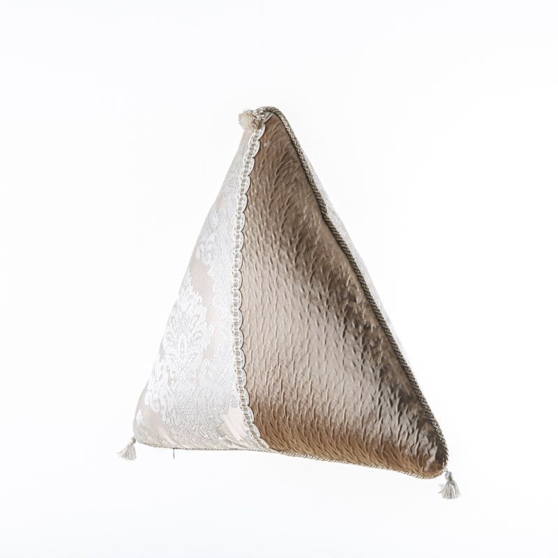 Оригинальная треугольная дизайнерская подушка 55х55х55 см. Выполнена из жаккарда и декорирована кисточками, ажурной тесьмой и витым шнуром. Потайная молния расположена в нижнем шве. Декоративные подушки сделают акцет на цветовой гамме Вашего помещения, подчеркнут особенности интерьерного стиля или тематику оформления. Внутреннее наполнение синтепон в хлопковом чехле.