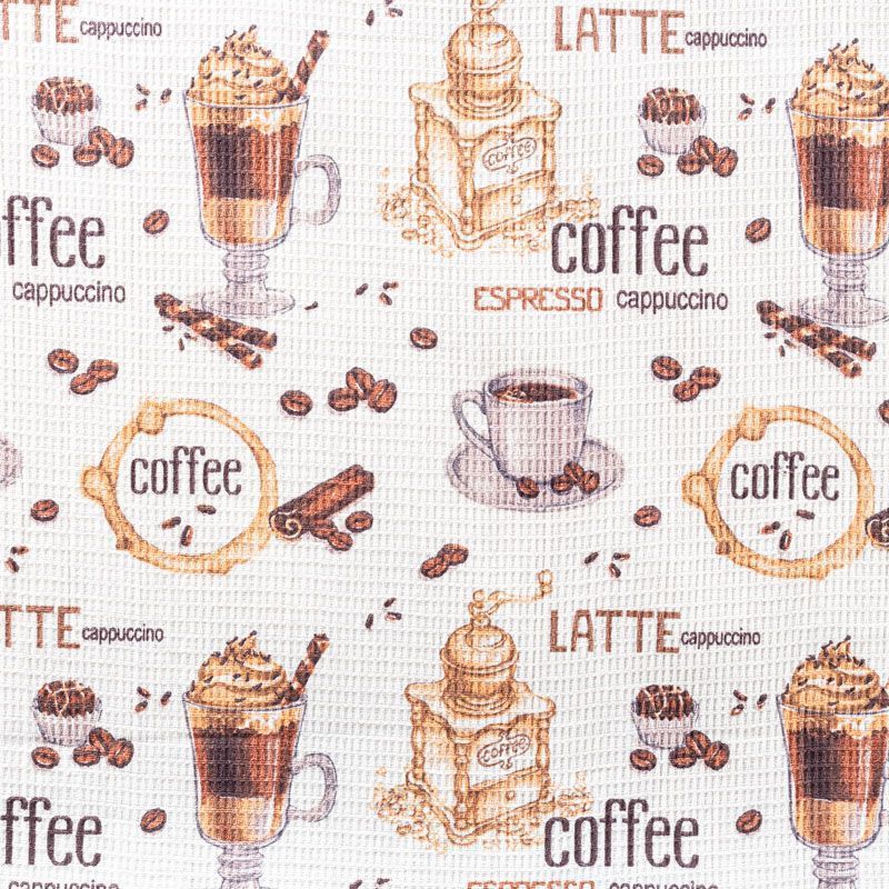 Качественная натуральная хлопчатобумажная ткань, обладающая высокой гигроскопичностью, с акварельным принтом на кофейную тему. Универсальный материал, из которого  шьют кухонные полотенца, скатерти, прихватки, салфетки.