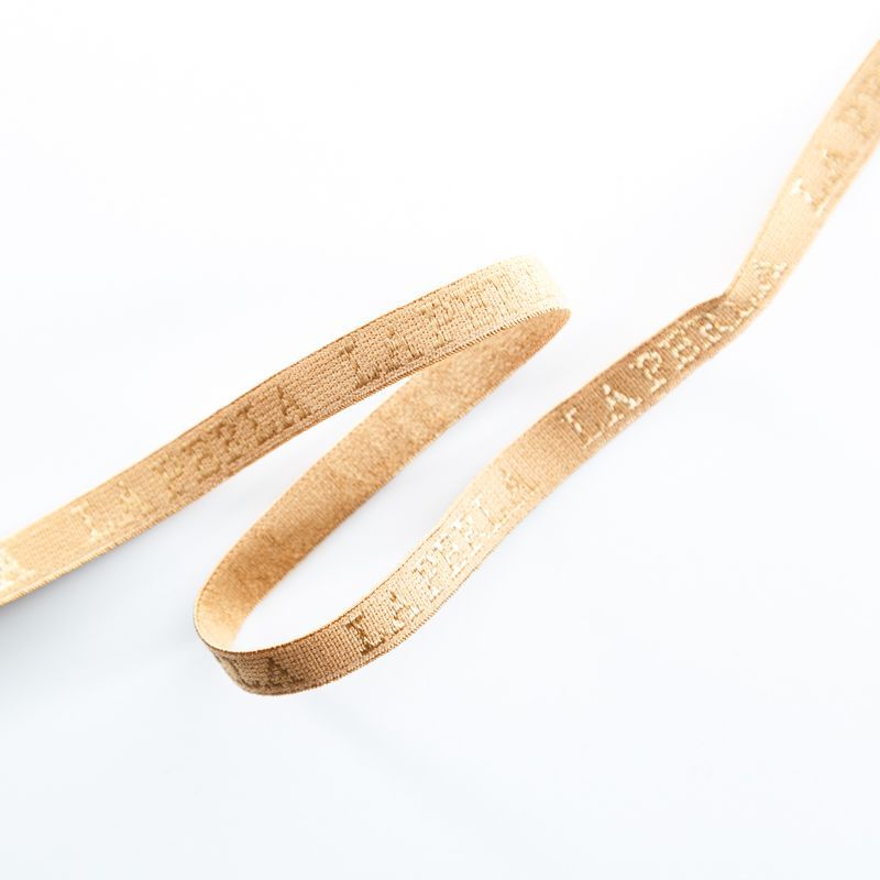 Бретелечная резинка используется для обработки стана бюстгальтера, а также для бретелей. Матовая с жаккардовой надписью бренда. Края ровные.