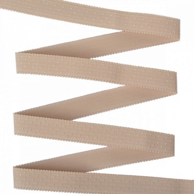 Классическая бретелечная резинка используется для обработки стана бюстгальтера, а также для бретелей. Достаточно тонкая, не тугая.  Края фигурные, матовая. Растяжимость: 50 ± 10 %.