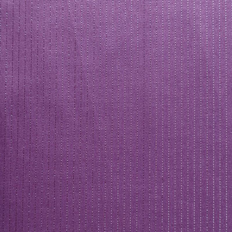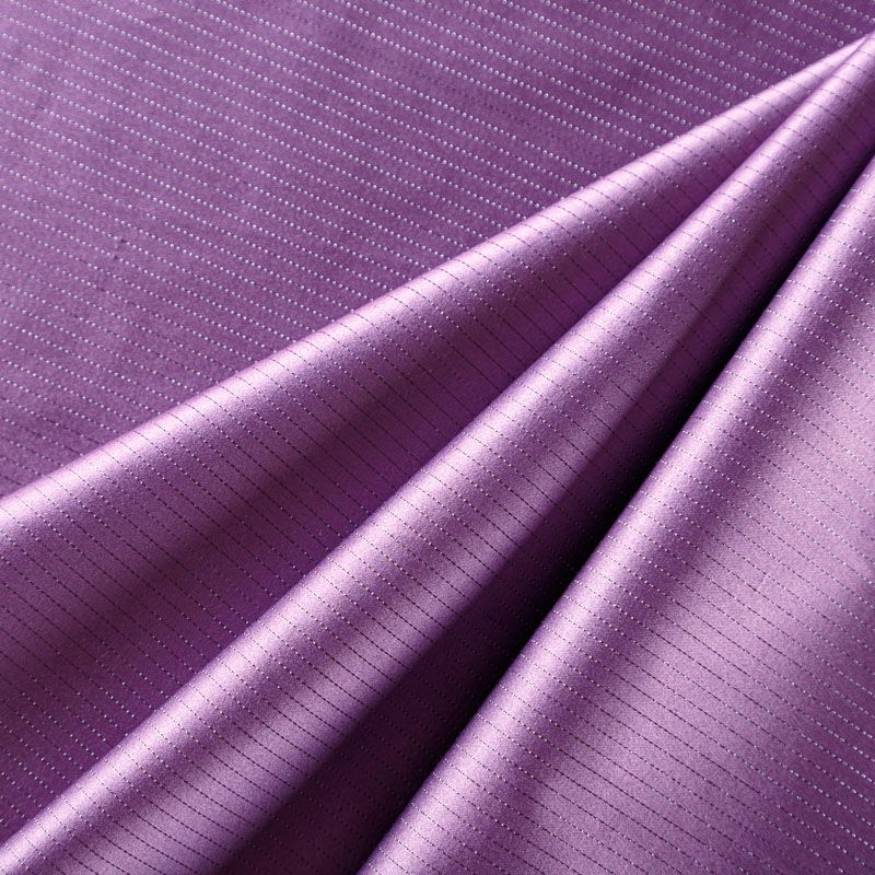 Сатин-коттон в сиреневом оттенке с тонкими полосками люрексовой нити. Поверхность гладкая со сдержанным блеском, ткань средней плотности, не толстая, хорошо держит форму, тянется за счет эластана в составе. Подойдет для пошива костюма, жакета, юбки, платья, брюк или шорт.