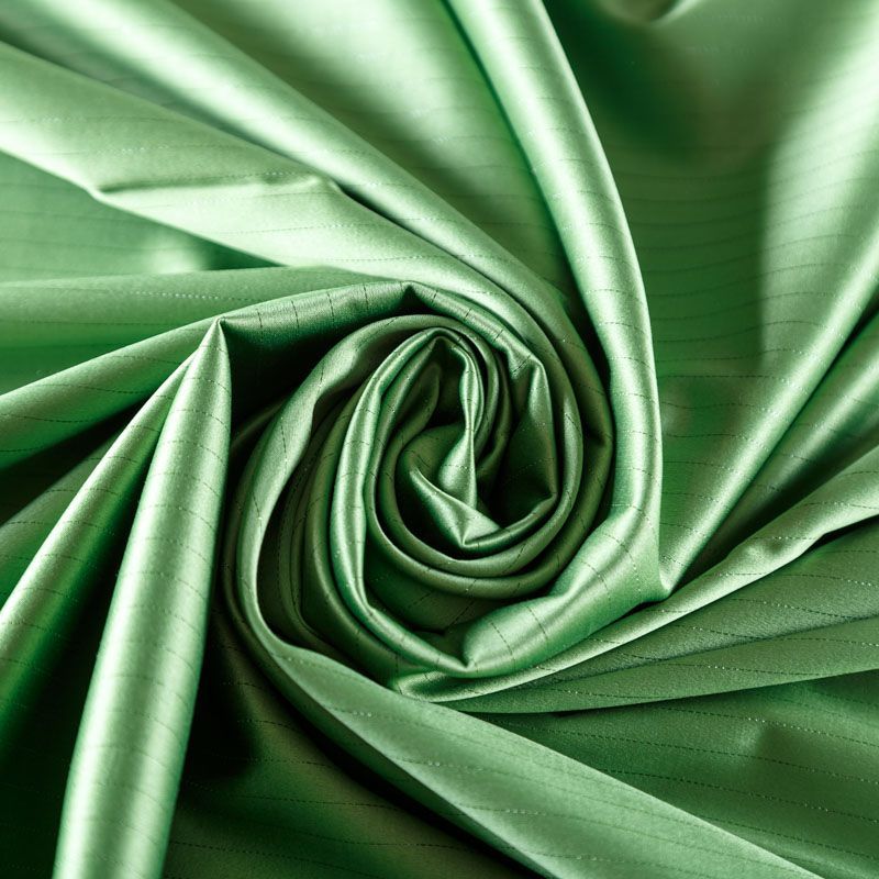 Сатин-коттон в зеленом оттенке с тонкими полосками люрексовой нити. Поверхность гладкая со сдержанным блеском, ткань средней плотности, не толстая, хорошо держит форму, тянется за счет эластана в составе. Подойдет для пошива костюма, жакета, юбки, платья, брюк или шорт.