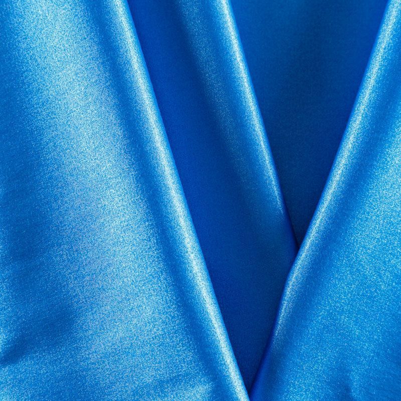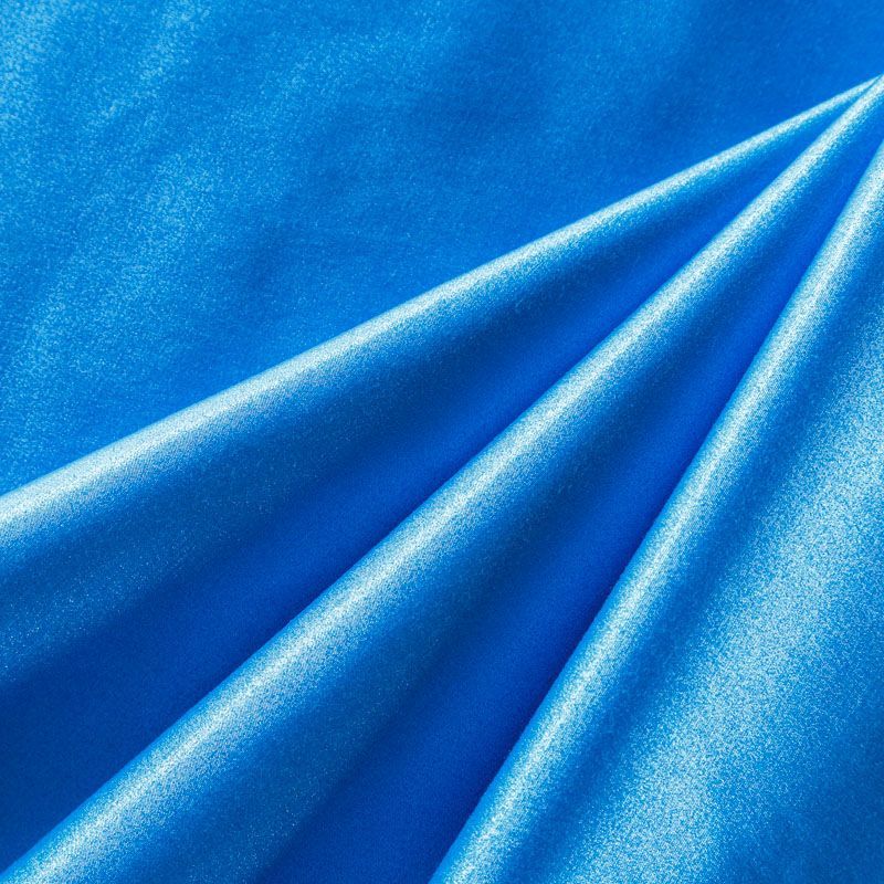 Итальянский сатин-коттон средней плотности в насыщенном голубом оттенке с содержанием люрексовой нити. Поверхность ткань слегка шероховатая, с искрящимся блеском. Материал хорошо держит форму и драпируется, тянется за счет эластана в составе. Подойдет для пошива нарядных костюмов, платьев, жакета, юбки, брюк или шорт.