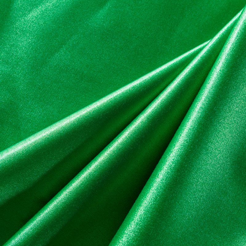 Итальянский сатин-коттон средней плотности в сочном зеленом оттенке с содержанием люрексовой нити. Поверхность ткань слегка шероховатая, с искрящимся блеском. Материал хорошо держит форму и драпируется, тянется за счет эластана в составе. Подойдет для пошива нарядных костюмов, платьев, жакета, юбки, брюк или шорт.