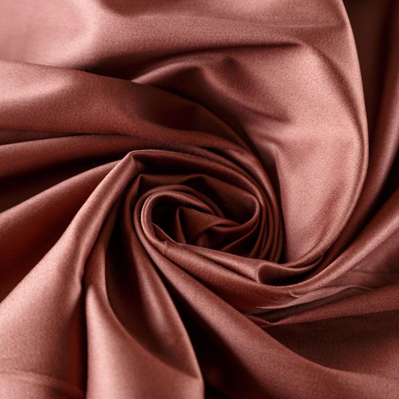 Сатин-коттон в коричневом оттенке, с гладкой поверхностью со сдержанным блеском, ткань средней плотности,  не толстая, хорошо держит форму, тянется за счет эластана в составе. Подойдет для пошива костюма, жакета, юбки, платья, брюк или шорт.