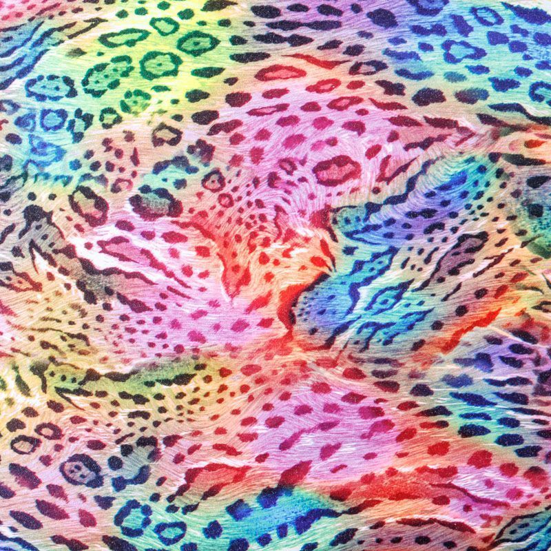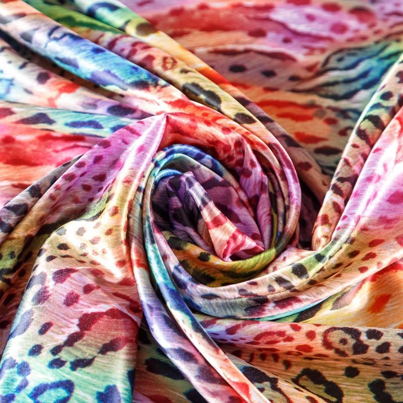 Сатин-коттон в ярких оттенках со стилизованным анималистическим принтом, с гладкой поверхностью со сдержанным блеском, ткань средней плотности,  не толстая, хорошо держит форму, тянется за счет эластана в составе. Подойдет для пошива костюма, жакета, юбки, платья, брюк или шорт.