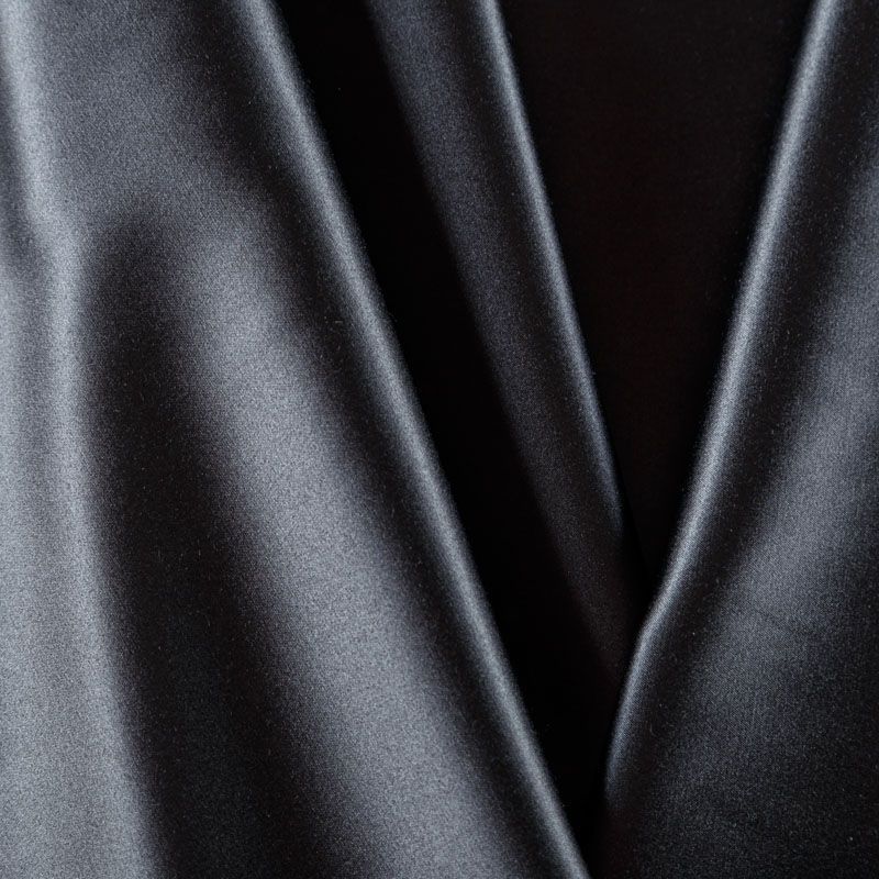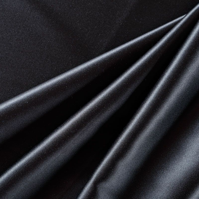 Сатин-коттон в черном цвете, с гладкой поверхностью со сдержанным блеском, ткань средней плотности,  не толстая, хорошо держит форму, тянется за счет эластана в составе. Подойдет для пошива костюма, жакета, юбки, платья, брюк или шорт.