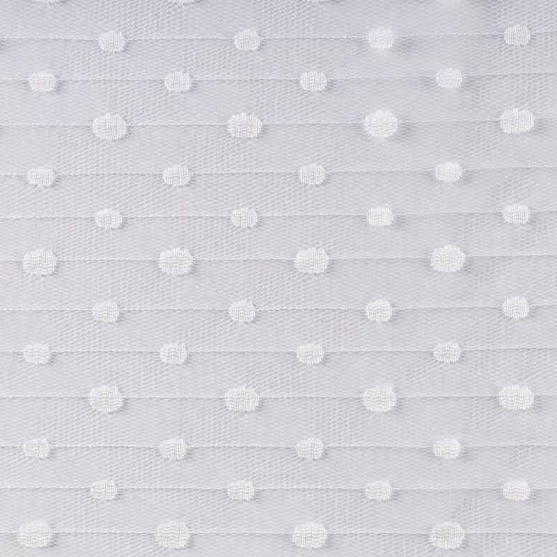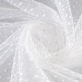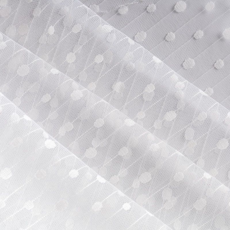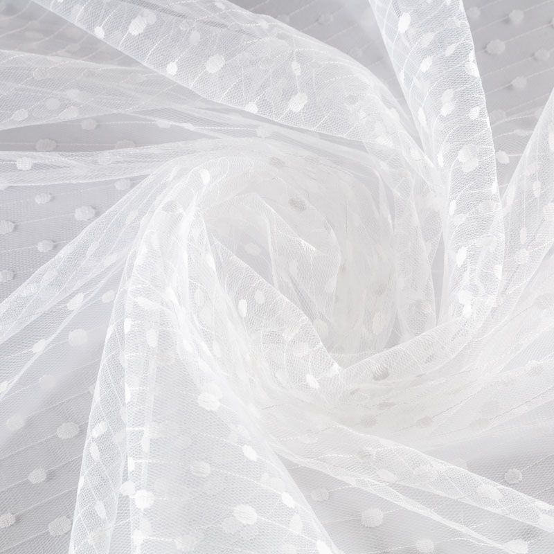 Тонкое, нежное, мягкое и прозрачное полотно, состоящее из мелких ячеек, на которых нанесен рельефный плетеный принт в виде тонких полосок с горошинами.  Красиво драпируется, тянется, применяется для декорирования деталей одежды, например, рукавов изделия, для пошива нарядной и повседневной одежды: топов, блузок, пышных юбок и платьев.